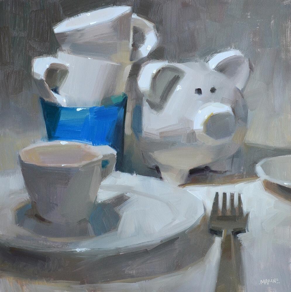 Ever since I started painting still life, I have kept my eyes peeled for fun props to add to my scenes. I remember when I found my first piggy bank at a thrift store - I was so excited to get home and paint him! Since then I have accumulated more pigs (different sizes and colors) and painted them all many times. They add such personality to the scenes, and depending on how I pose and light them, and what they are surrounded by, the story is always different. |